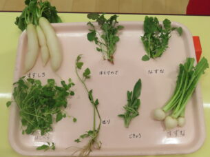 子どもたちは、「七草」の7種類の野菜と名前を知ることができました😊