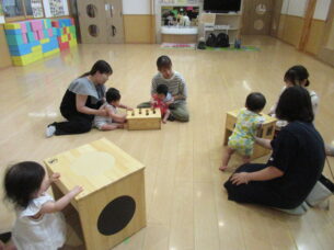 講師の花輪あゆみ先生のピアノに合わせて季節の歌を歌ったり、動物さんの楽器や「OTOMORI」を使ってリズム打ちをしました。0歳から始められるリトミックは、音感やリズム感を身に付けるだけでなく表現力や集中力アップなど様々な効果が期待できます。