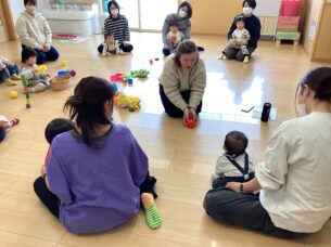 また、曲に合わせてからだの部位をタッチしていく手遊びでは、頭や腕、足を触って親子でふれあう姿も見られました