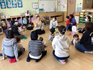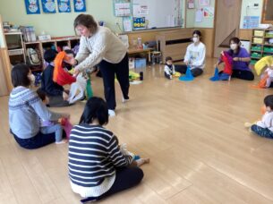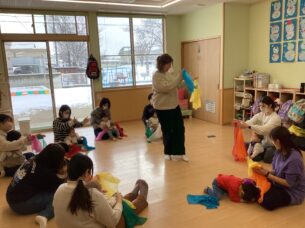 講師のアリラ・ブライドン先生(マイ英語スクール)が、英語で話しかけたり英語の歌を口ずさむと子どもたちはニコニコ笑顔に😊手拍子をしたり、スカーフを揺らしてリズムに乗っているお子さんもいましたよ♪